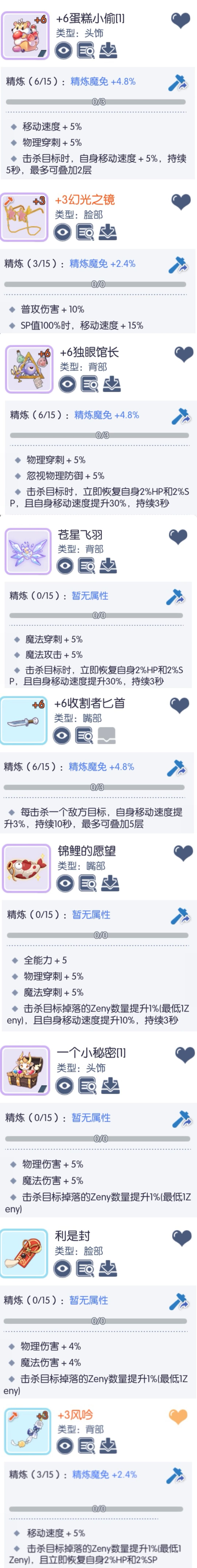 扭蛋由于尾部已经定了是减延迟的,剩余部位可选的有移速相关或者当你移速购330时,选择增加zeny掉落的头饰。以下几个是综合下来我较为推荐的,移速太快也可能会跑偏所以可以考虑穿几件+zeny的最大化收益。