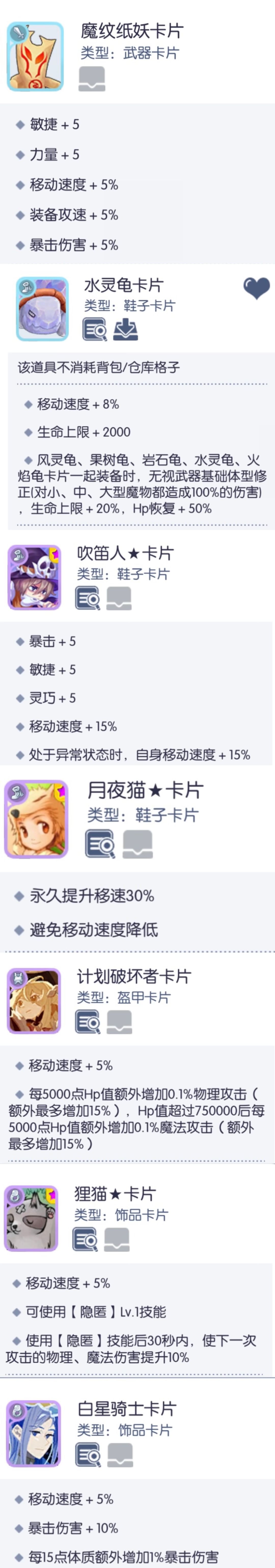 卡片:由于伤害上不会有什么太大的问题,所以卡片选择上,有移速的尽量选择移速卡片,没有移速位置的可以随意选择。实际上因为卡片获取难度,一般就是武器选择2张纸妖卡以及鞋子选择水灵龟或者吹笛人星。其他的卡片相对而言性价比不高,有的话可以用。