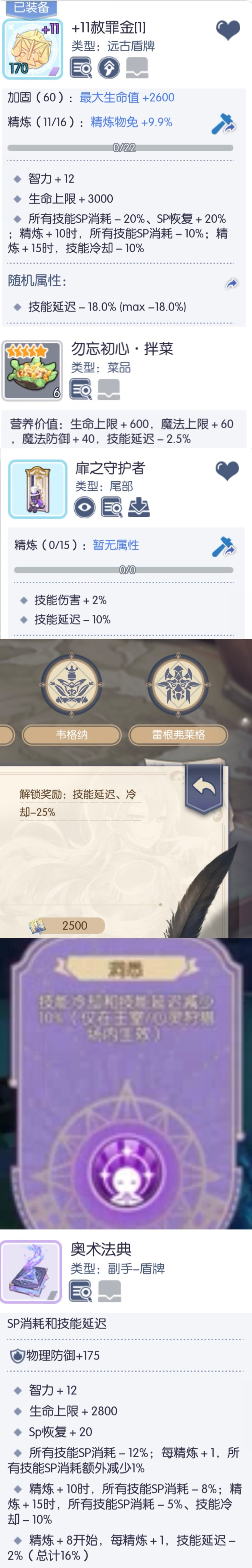 满足了伤害之后,那么来看下技能延迟。核心为远古副手的-18%,6层食物=2.5%*6=15%,尾巴10%,地图buff(王室2张图和克魔的做完任务后都有-25%,此外心灵每日占卜可以刷出紫色的buff有10%,影子部分选择15的奥数法典的话目前30%影子状态下有16%*0.3=4.8%的技能延迟。(但是由于造价太高所以并非必须品,随缘即可)
