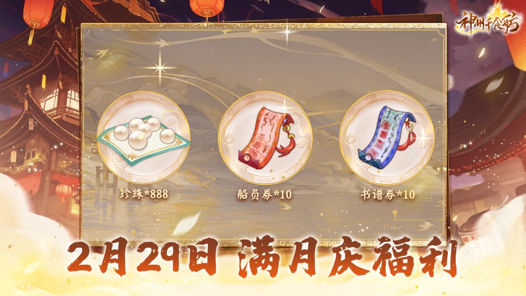 为了庆祝神州千食舫的满月,舫会为舫主们带来了密令福利~在游戏中输入“船舫开业满月庆”即可领取舫会为舫主准备的满月好礼【船员券*10】!现在登录游戏,还可以领取满月庆福利邮件哦,内含【书谱券*10+珍珠*888】!舫主们快快上线吧!
