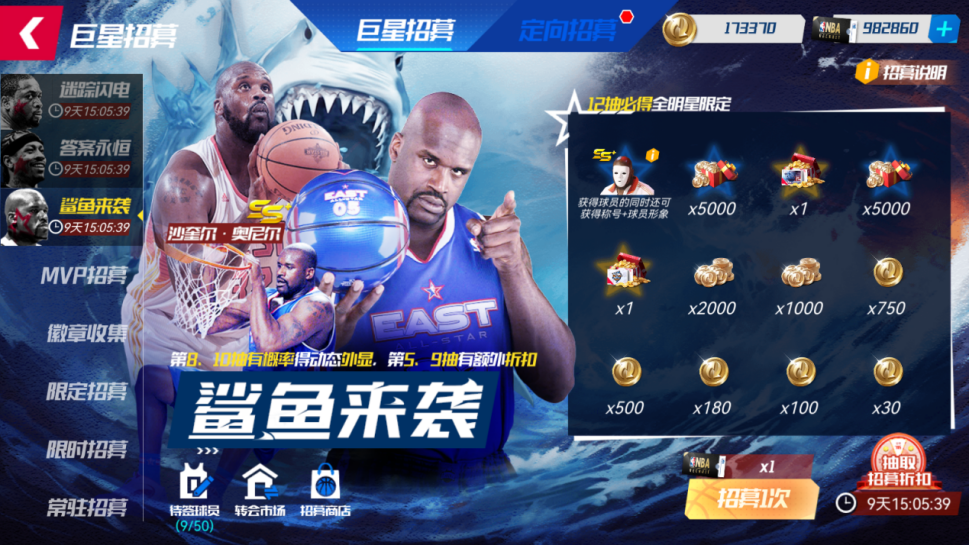 活动期间,可使用【精准招募函】在【精准招募-鲨鱼来袭】池中,招募全明星队奥尼尔。