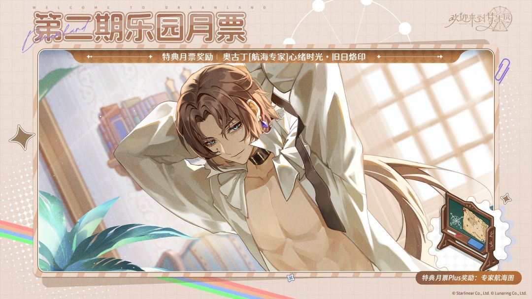 -奖励内容:解锁乐园月票进阶奖励、奥古丁[航海专家]心绪时光·旧日烙印、夜光钻×200、豪华乐园餐×2、奥古丁[航海专家]专属互动家具「专家航海图」