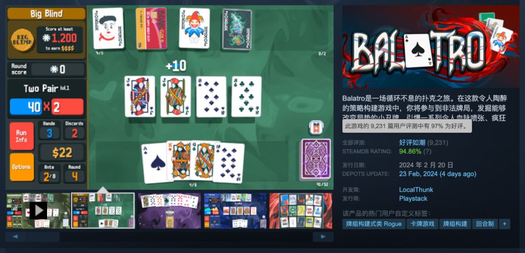 在几天前,有人给我推荐了一款打牌游戏——《小丑牌》(Balatro)。