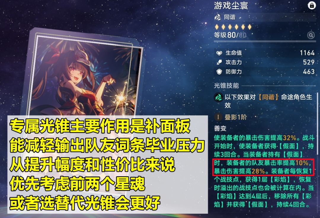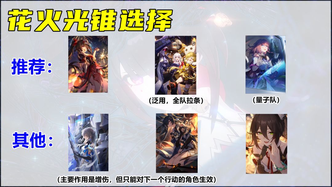 【光锥选择】首选专属光锥游戏尘寰。替代光锥方面,推荐首选可以全队拉条的舞舞舞(泛用),以及在纯量子队,可以同时给其他三位队友增伤的与行星相会。再然后是“但战斗还未结束”以及“过往未来”,但战斗还未结束的充能和回战技点对花火意义不大,所以主要作用和过往未来相近,都是给下一位行动的队友增伤。最后还可以考虑镂月裁云之意。至于平时用得比较多的记忆中的模样和轮契,花火即使带了也基本做不到两动一大,所以就不推荐了。