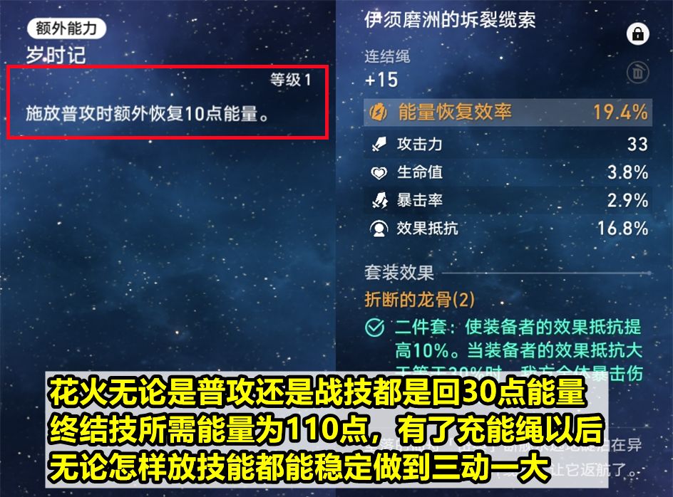 词条方面只需记住一点,保证充能绳以后,优先堆暴伤和速度即可。主词条选择:暴伤衣、速度鞋、生命/防御球、充能绳。有了充能绳,花火就能做到稳定三动一大了。副词条推荐:速度=暴击伤害>效果抵抗>生命/防御。