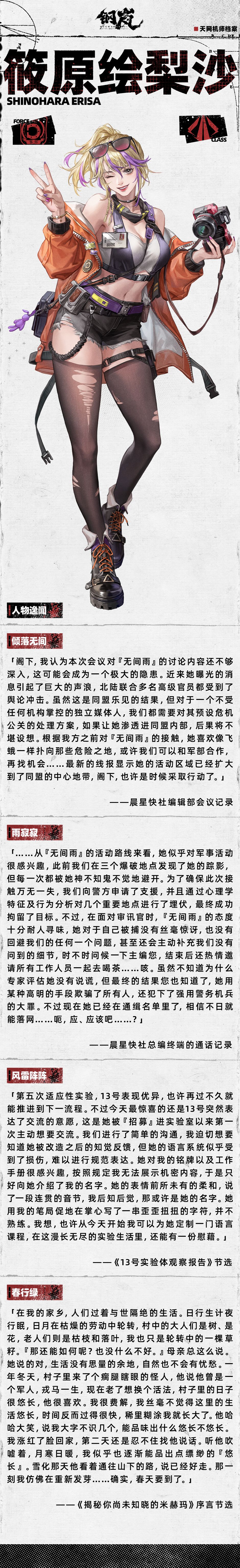「筱原绘梨沙」,曾是超适体的实验对象,代号为13号实验体,在洛莎带来的联合军动乱中出逃。后来成为了一位记者,虽然自称是「籍籍无名的小记者」,但她「无间雨」的别名早已辗转出现在各大媒体甚至军部机构的情报网中。自她笔下的新闻总如金石击鼓,业内人士曾一针见血地评价——「仿佛有根意想不到的针挑破了一些人最难以启齿的脓疱」。当她扛着设备微笑露面时,往往预示着新的狂潮即将来袭……