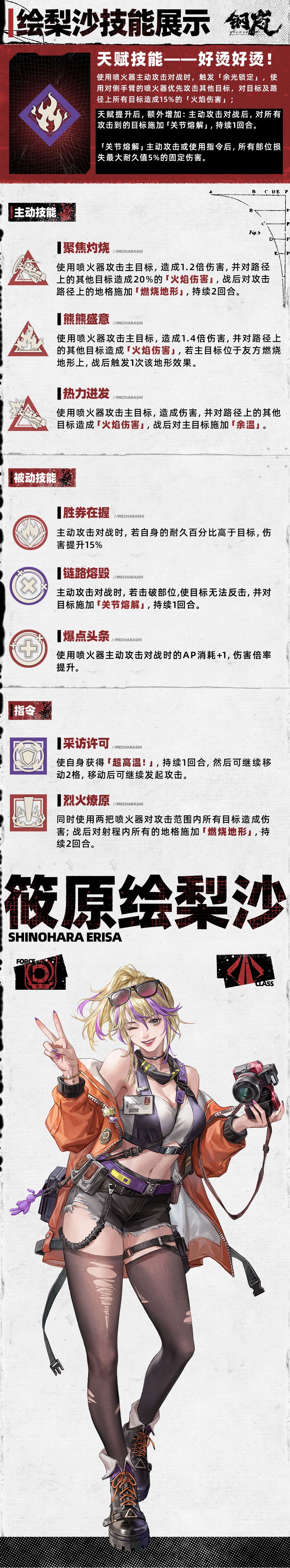 对作为突击手的「绘梨沙」来说,喷火器是她作战时最常用的武器。她擅长在中近距离对敌方单位造成伤害并铺设火焰地形,天赋「好烫好烫!」使她在攻击主目标时也能对攻击范围内的其他敌人造成不俗的伤害。