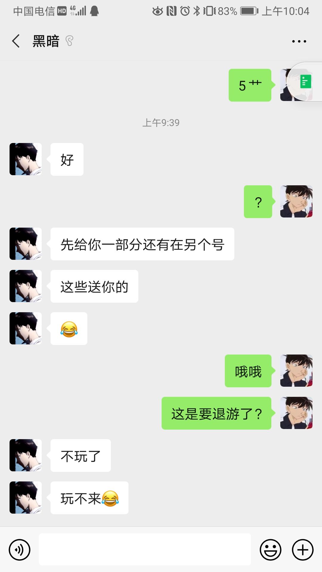 怎么说呢,也就85,不多,但是真的心疼你的节操。退游就能为所欲为了吗?名字,id,微信,账号都可以变化,所以我懒得去记,也懒得计较,你不配啊。