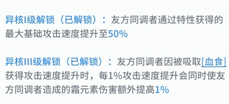 比戈尼娅升花可提高攻速加成,0花也可以用,作为霜元素尖峰,3花时,被动血食的全员加攻速可达50%,叠满被动时,提高我方50%的霜元素伤害,(满层换上禺期T)。