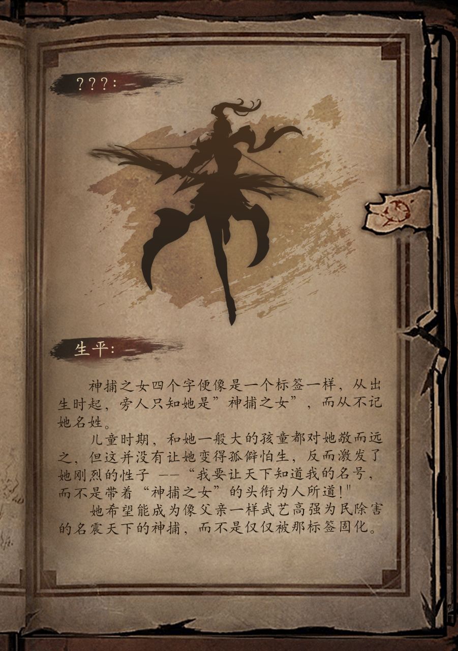 今日还请劳烦继续补全见闻录残缺处,比起【神捕之女】这样让人熟知的称呼外,此侠客其真人真名却鲜为人知!小昭对此也知之甚少,不止涤罪师大人能否想起此侠客?还望涤罪师大人能够根据描述及图片填补出是哪位侠客!报酬小昭定在三日之后送至各位涤罪师大人手中,祝大人福星高照!
