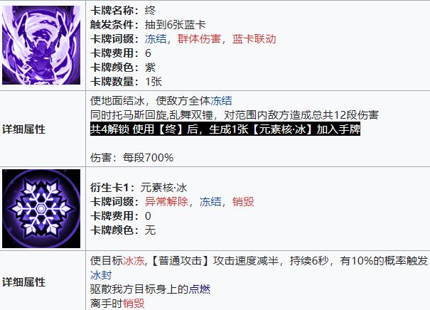 使对方全体【冻结】,同时造成12×700%的aoe伤害,之后增加一张【元素核·冰】到手牌中