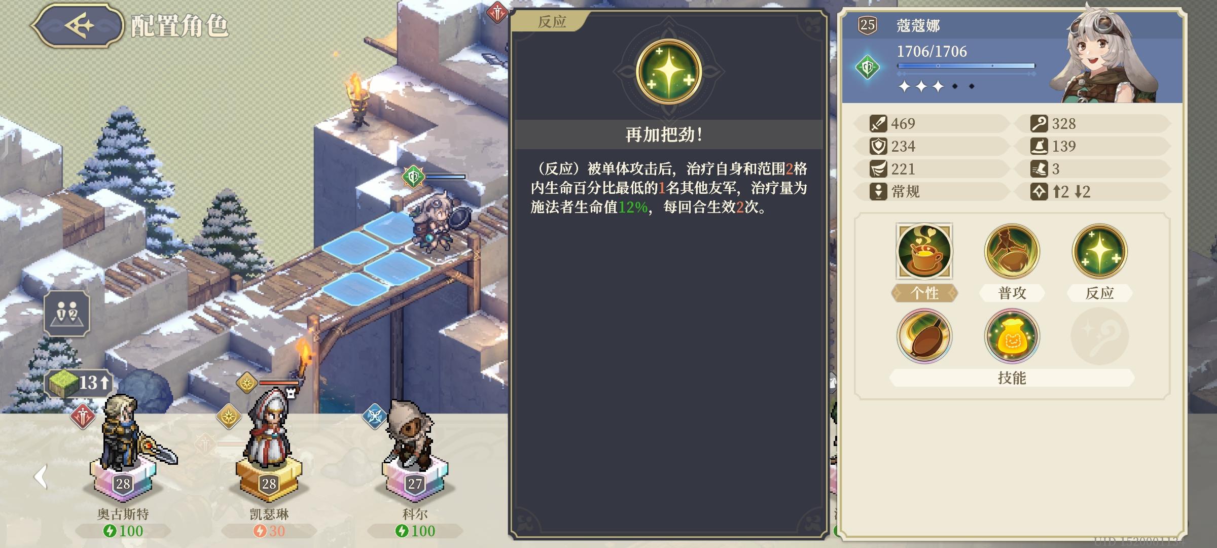 被单体攻击可以治疗自身和范围二格内生命百分比最低的友军,恢复效果根据蔻蔻娜的生命值,每回合生效两次,还算不错的反应技