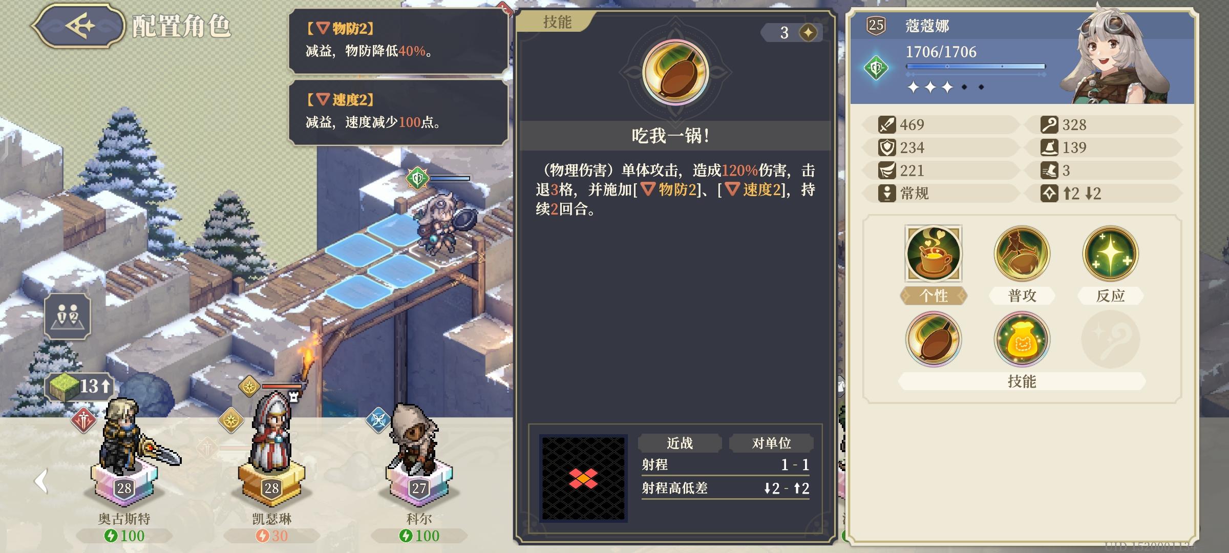 最后铁锅乱炖为友方提供暴击爆伤➕便当,治疗效果为蔻蔻娜30%生命值,范围是自身三格范围。
