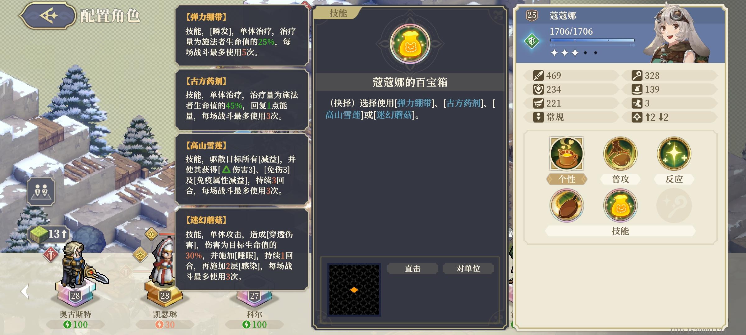 自选技能,每回合只能用一个,常用的只有药剂和雪莲,绷带瞬发紧急治疗