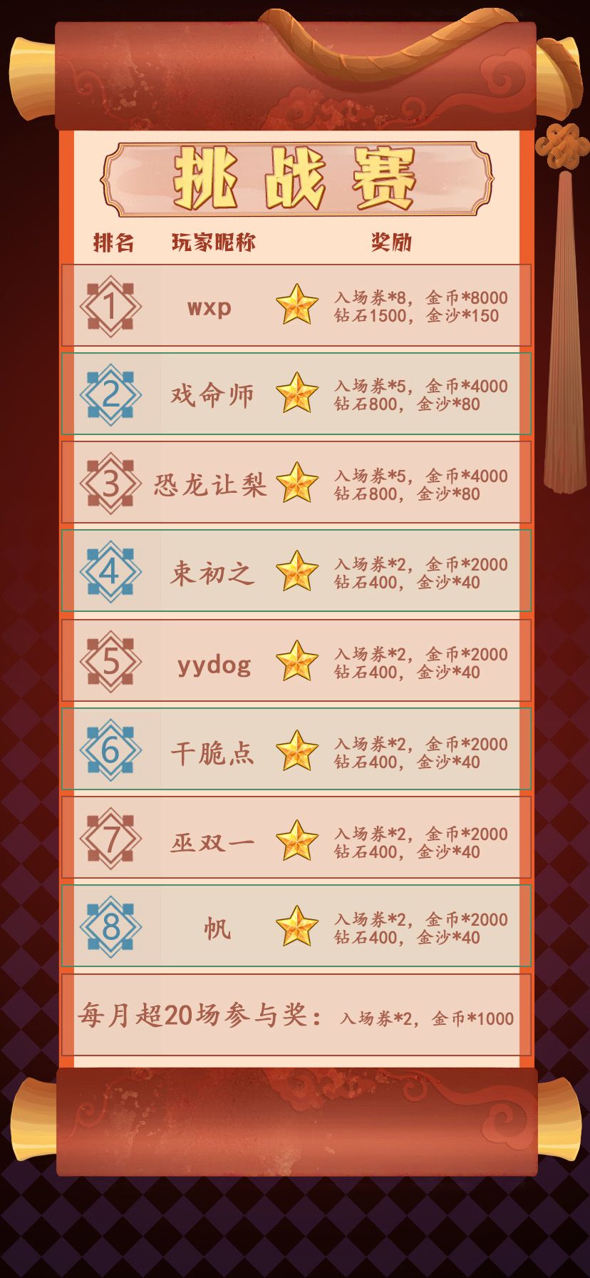 春节期间,参与挑战赛获得的线下奖励激增,恭喜以下主公登榜~