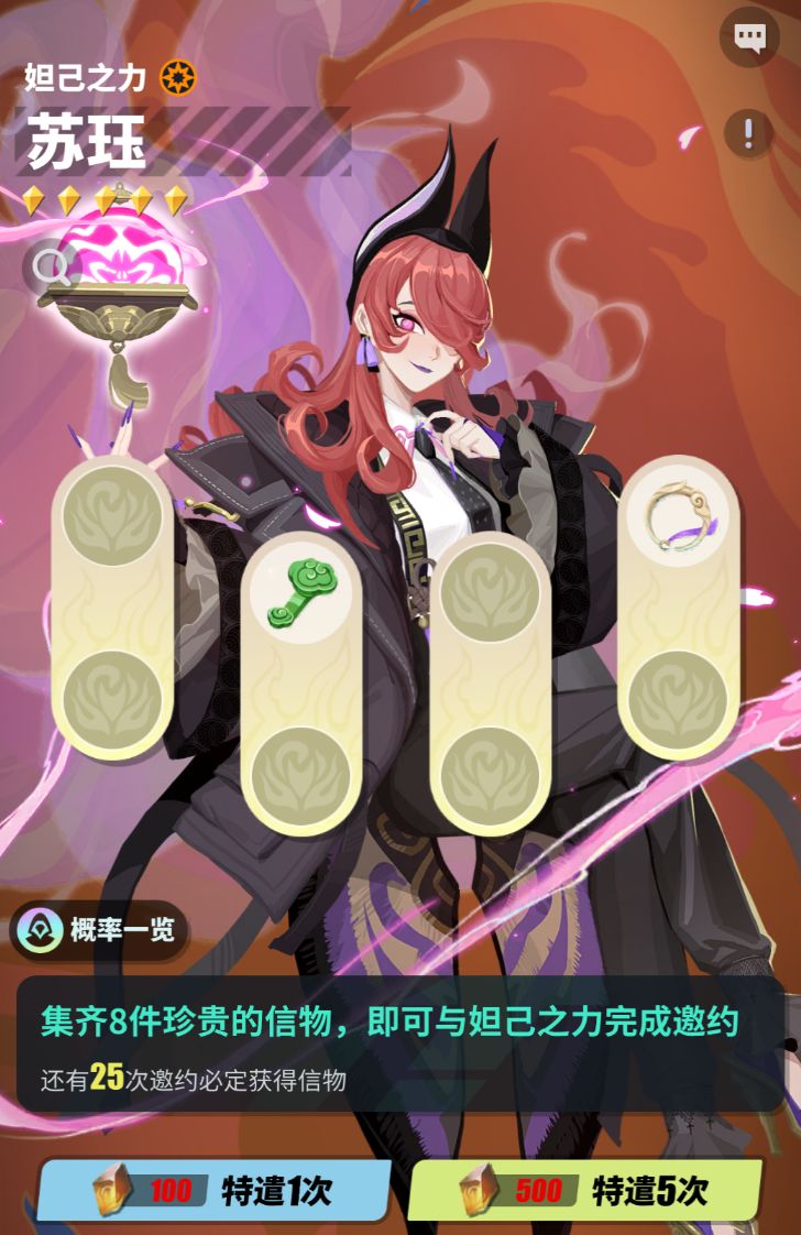 【妲己苏珏】需要通过专属的狐仙之约获得,使用【秘藏碎片】可以参与特遣,抽取【苏珏信物】。