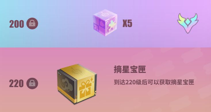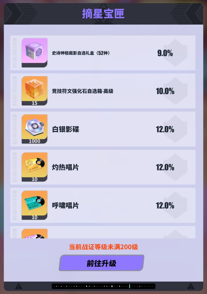 【赛季战证】基础奖励最高到200级,之后每20级会获得一个【摘星宝匣】,其中可以开出史诗裁影自选礼盒、高级竞技符文强化石、白影影碟、灼热呼啸涌动唱片、体力和金币。