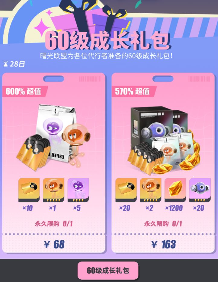 等级每提升10级,还可以解锁2个限购1次的对应级成长礼包。这里只列举目前我账号上的60级成长礼包,