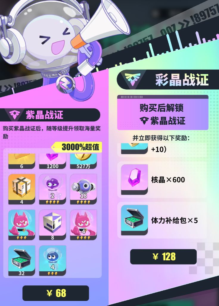 【神迹战证】有包括核晶、抽卡券、体力、金币和养成资源在内的基础奖励,我们也可以通过氪金,解锁高级的【紫晶战证】和【彩晶战证】,68元的【紫晶战证】里面有6张普通抽卡券、1200核晶和各种养成资源,包括传说品质的升星技能经验精灵、金币、体力以及声波自选包。