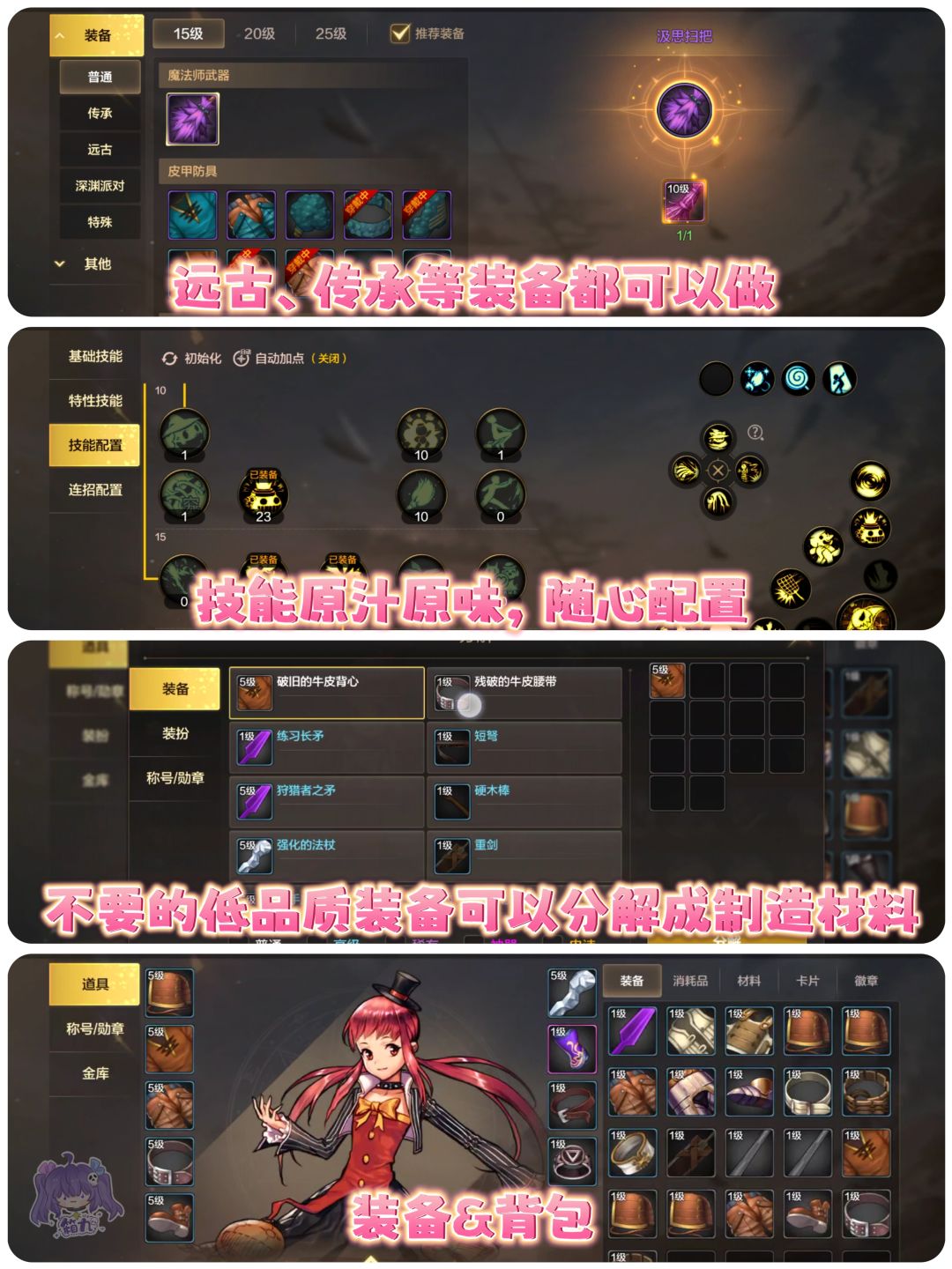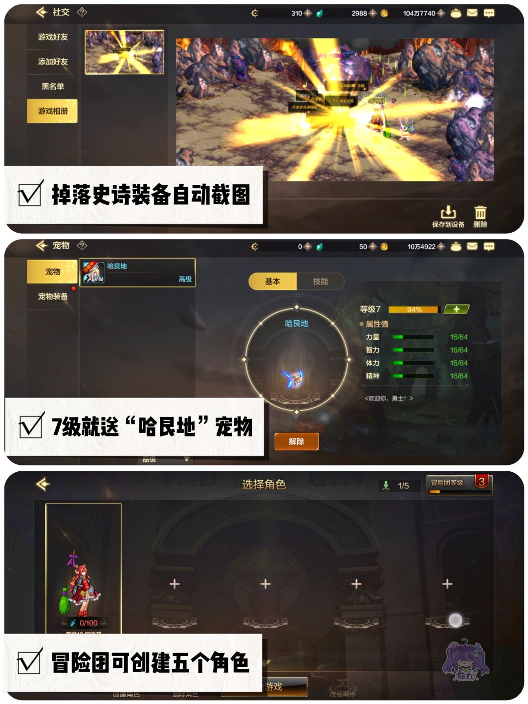 ✅宠物&装备:玩家7级就可以开启宠物功能,系统会送一只 “哈艮地”,我当年最喜欢的宠物之一,嘿嘿。传承、远古和深渊装备也采取了材料制作方式,低级装备也可以当制作素材来打造高级装备。