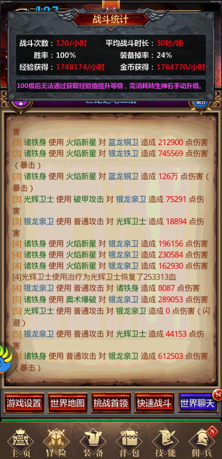 给刚来的萌新一点小小的改注意的地方!在下方冒险一栏战斗日志这个页面是可以看到是可以看到战斗统计的,战斗统计里有每个小时的战斗次数,每一场所用的战斗时间,有胜率,装备掉率,每个小时可以获得的经验以及每个小时可以获得的金币,需要注意的是打赢boss观察一下战斗统计,胜率是不是100百分之百,不是百分之百胜率快速战斗获得的经验会少很多,不是最高级地图就获得经验最多,这需要经常观察战斗统计
