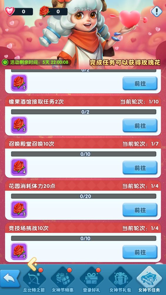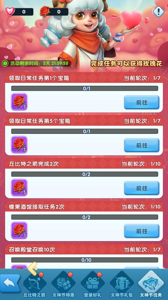 4、 女神庆典期间,开放活跃任务,可以获得玫瑰花。