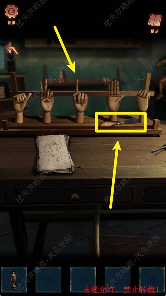 191.根据线索提示,将桌子上的手势调整为下图所示顺序,并从握着铲子的手中获取掉落的【木铲刀】。 191