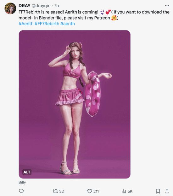 【游戏资讯】 《最终幻想7:重生》正式发售,3D渲染爱好者@drayqin也宣布,他的泳装爱丽丝3D模型也已制作完成,之前他做了蒂法的泳装3D模型。 他已将模型传到了自己的Patreon主页,需要的玩家可开通会员下载,该网站需要特殊网络环境。 爱丽丝和蒂法,谁是你的菜呢