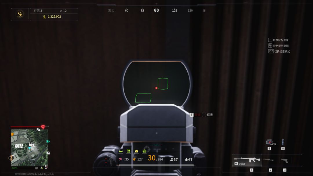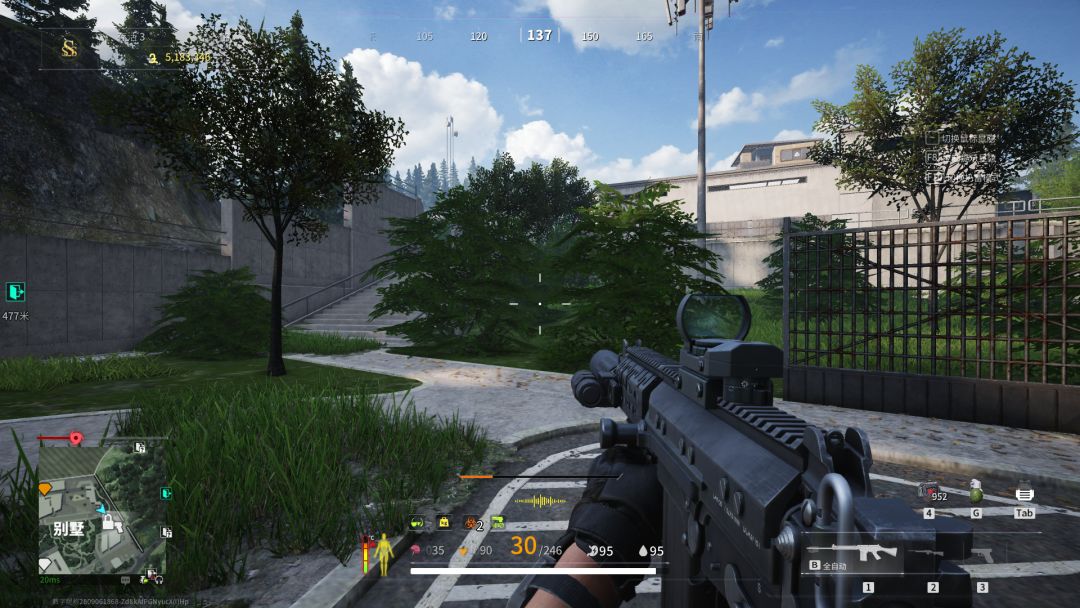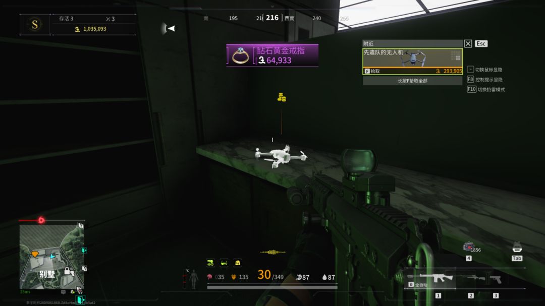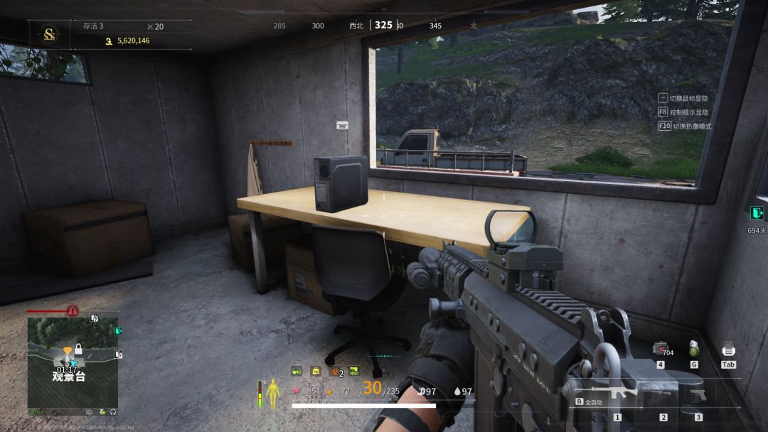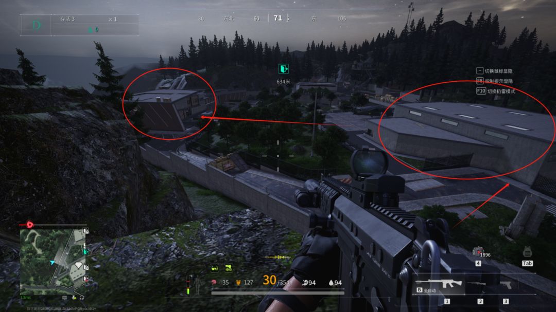 我们来到别墅旁边的山上架一下枪,查看一下别墅里面的情况,如果有人最好先打掉,随后,我们从就近的大仓搜索,然后再前往别墅主楼。