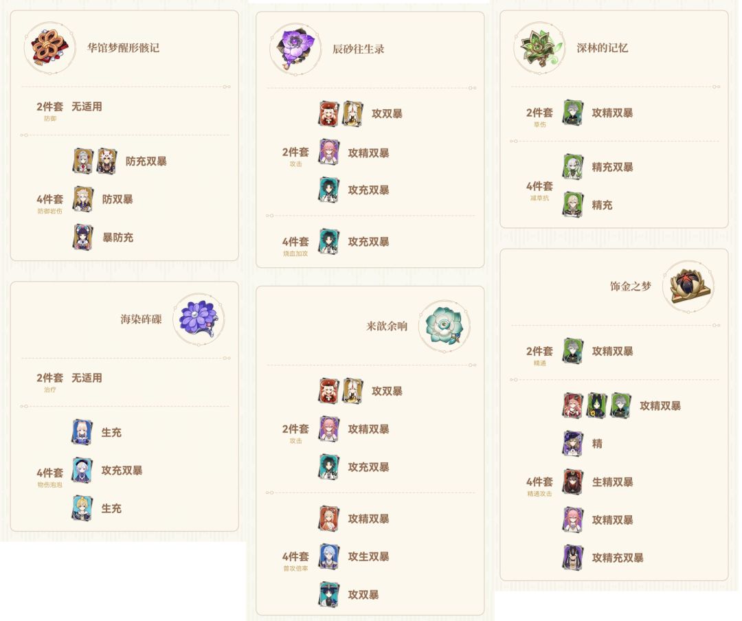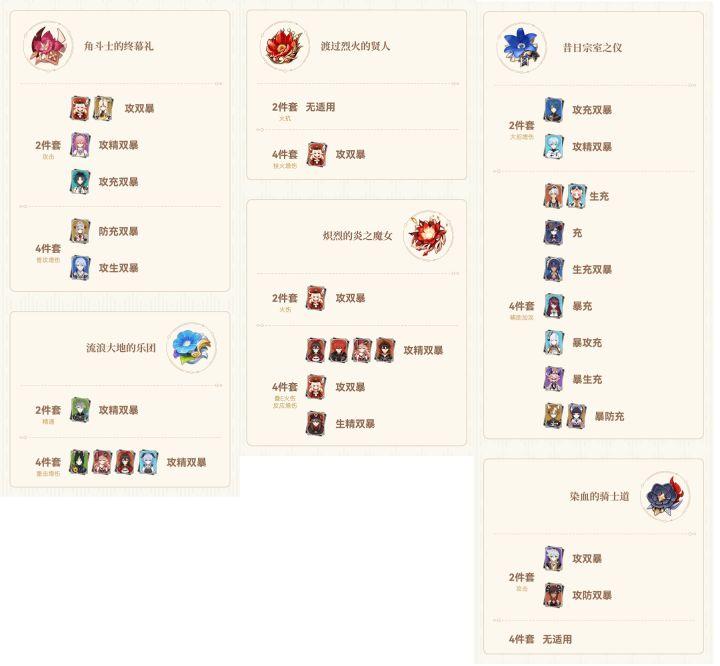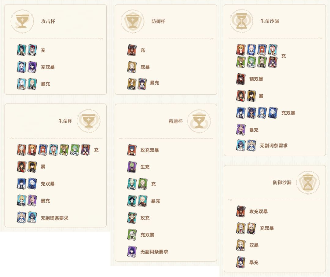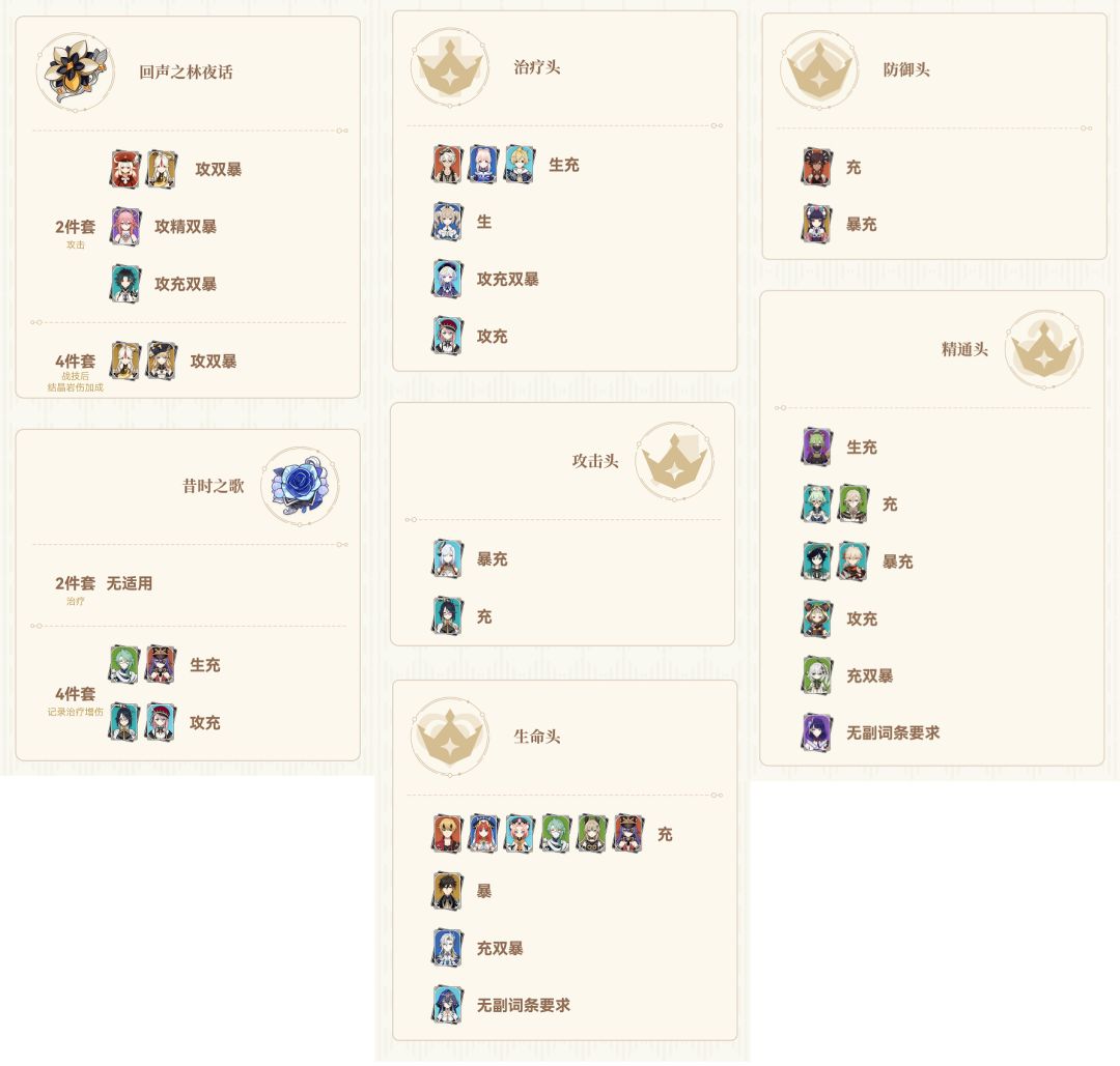 注:双暴头,属性伤害杯,攻击沙是一个输出角色的通用配装,不再详细列出适用角色。特别注意暴击头还可能给辅助角色用来触发西风武器
