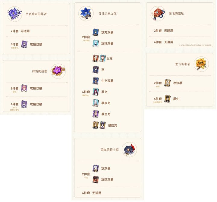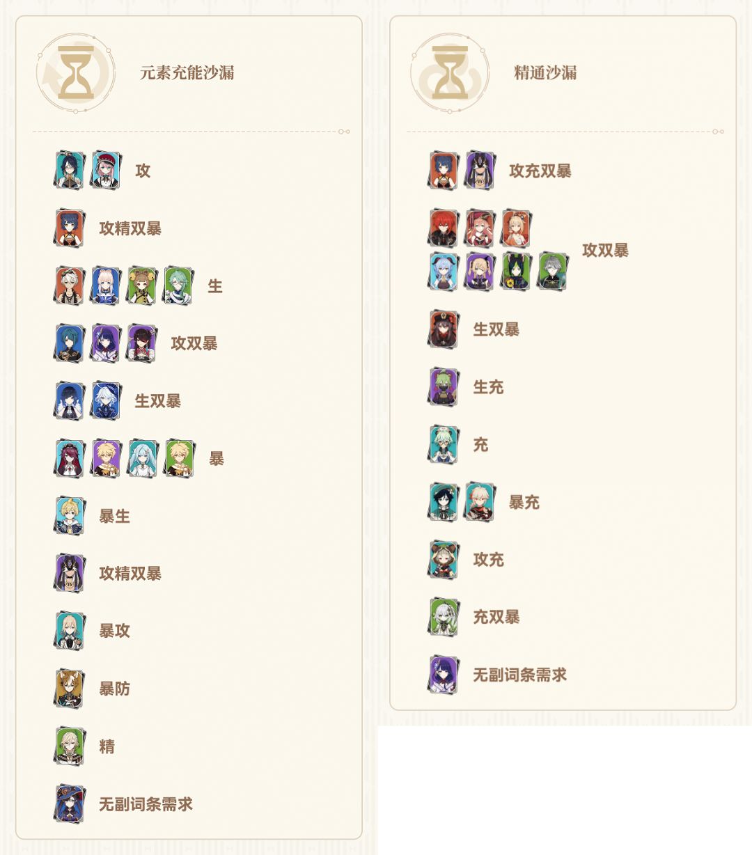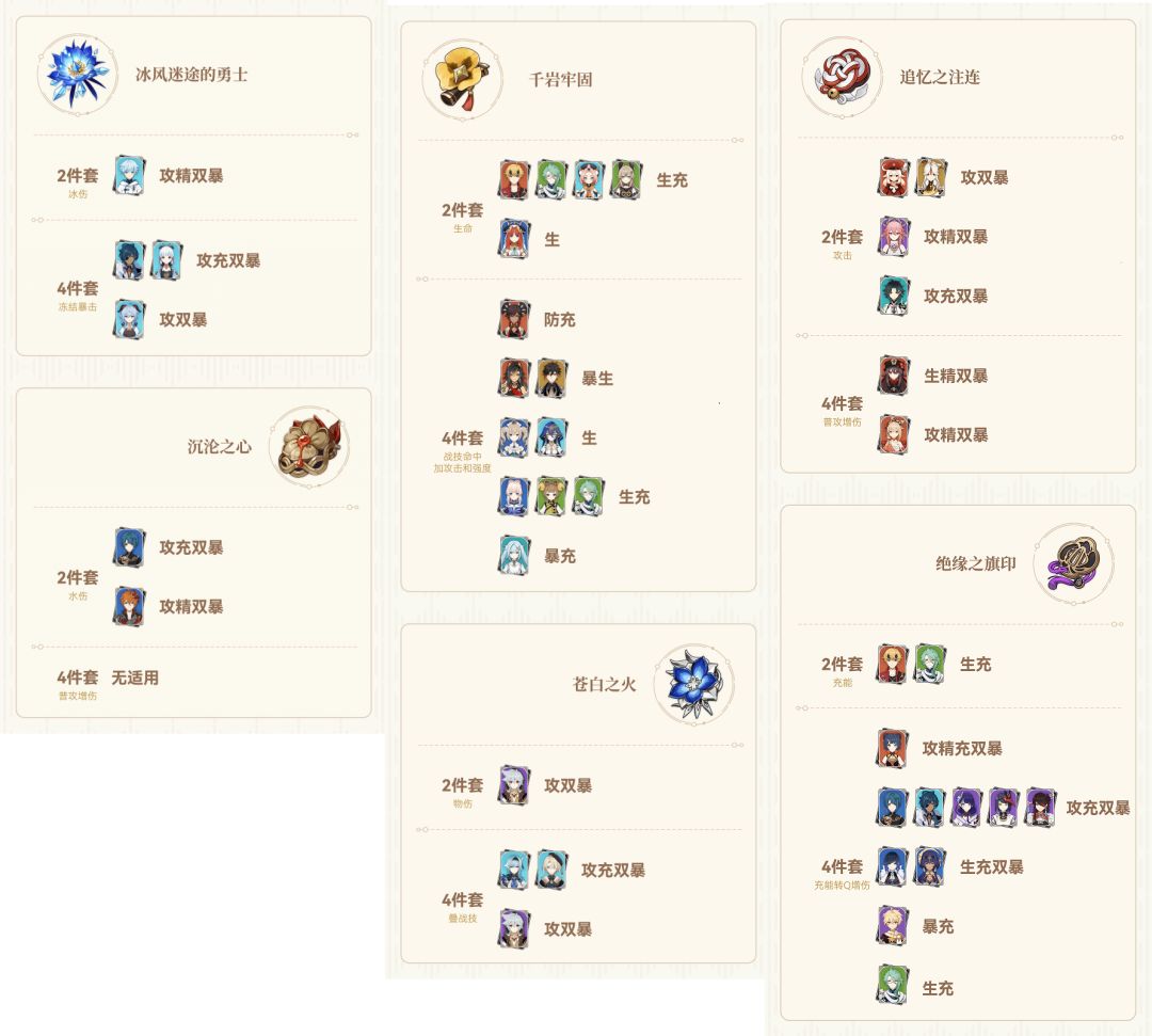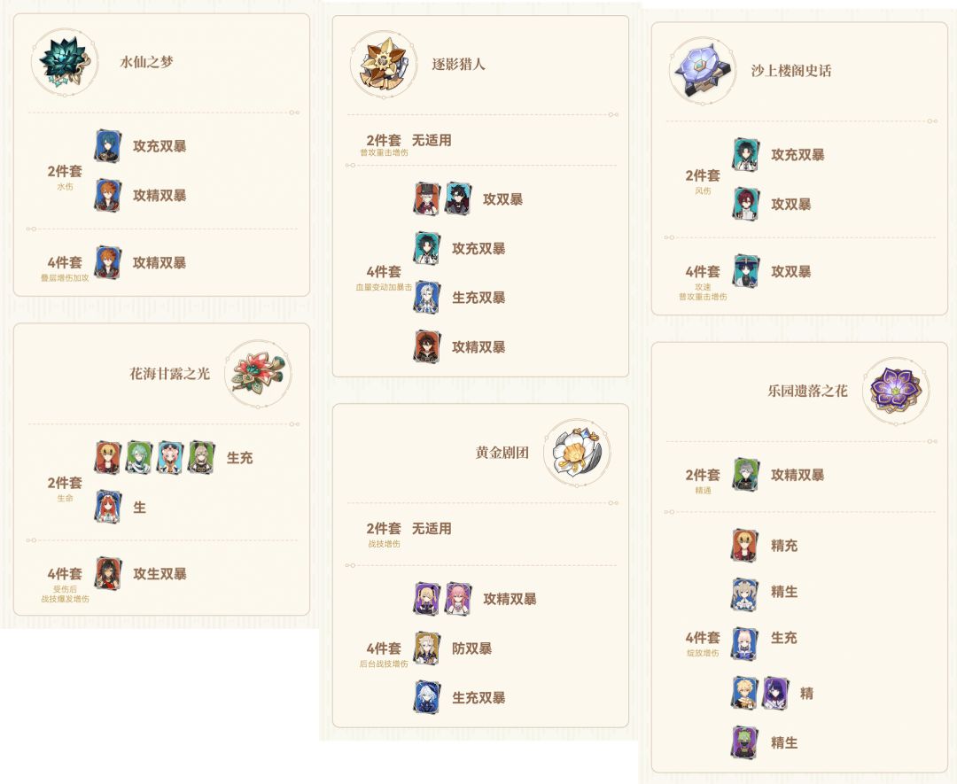 注:双暴头,属性伤害杯,攻击沙是一个输出角色的通用配装,不再详细列出适用角色。特别注意暴击头还可能给辅助角色用来触发西风武器