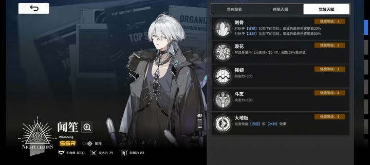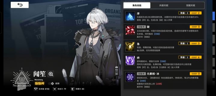队长位:SSR闻笙,使用六张蓝牌后刷新队长技,有对冻结单位增伤,因此配队选择蓝牌和有冻结卡的角色。
