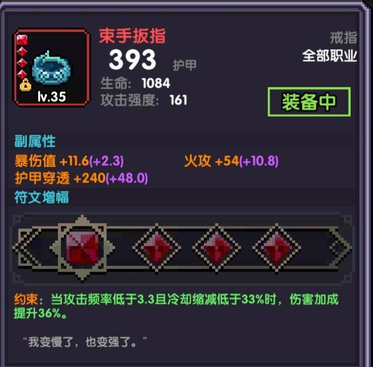 其次,束手戒指36伤害加成稳定,可以补全伤。