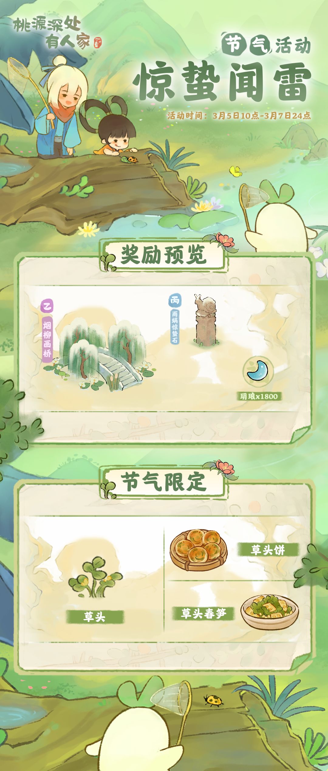 山民们在活动期间可以种植节气农作物「草头」,用来制作美味的节气菜品「草头饼」和「草头春笋」,听起来就很清新呢!小萝卜已准备好了本期的节气限定建筑,山民记得参与活动获取玥琅,不要错过兑换时间萝!阳气初惊蛰,韶光大地周。萝萝山春意渐浓,一切美好都在悄然发生!