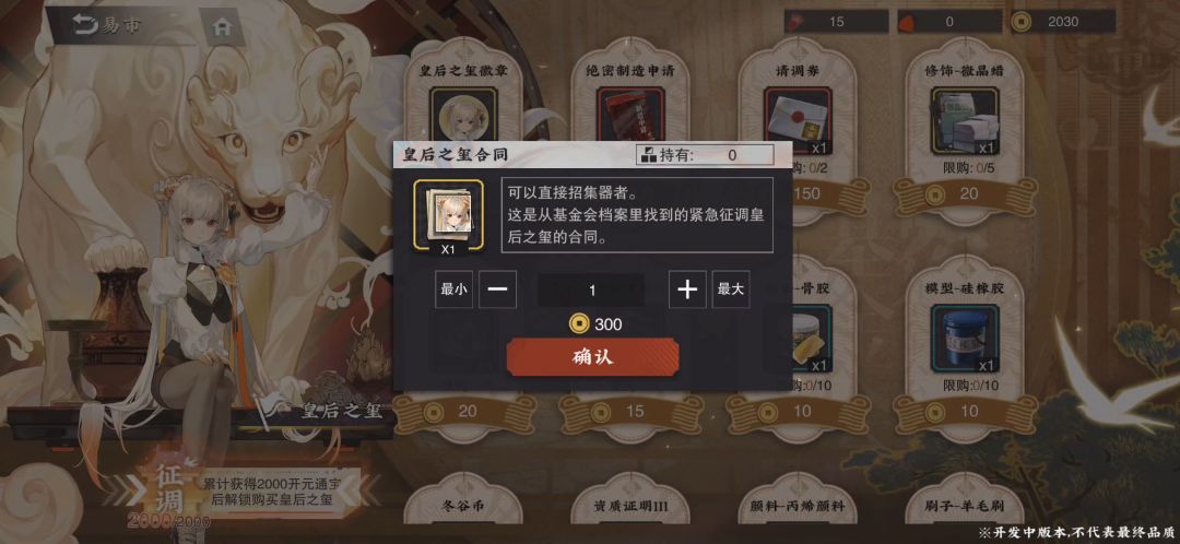 4. 解锁任务奖励,以及重复刷挑战关卡都可开元通宝,满2000可在意识中解锁战略器者皇后之玺,同时还可兑换6个徽章点满致知。此外还有稀有的红装制造申请、抽卡券和高级材料,非常超值。