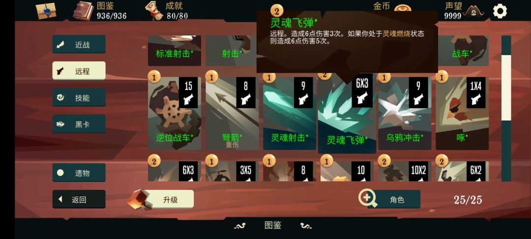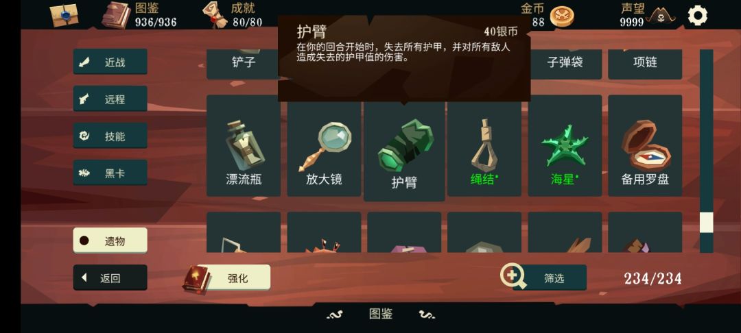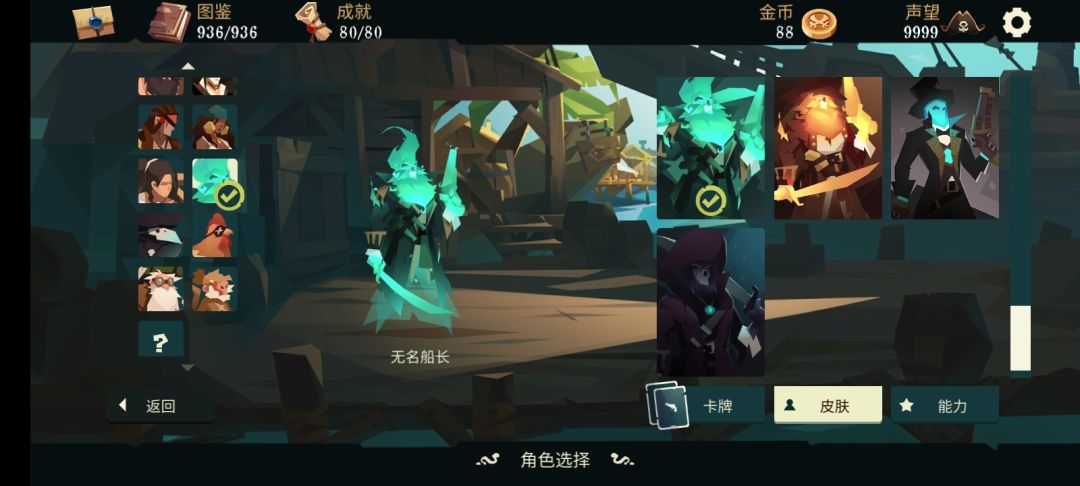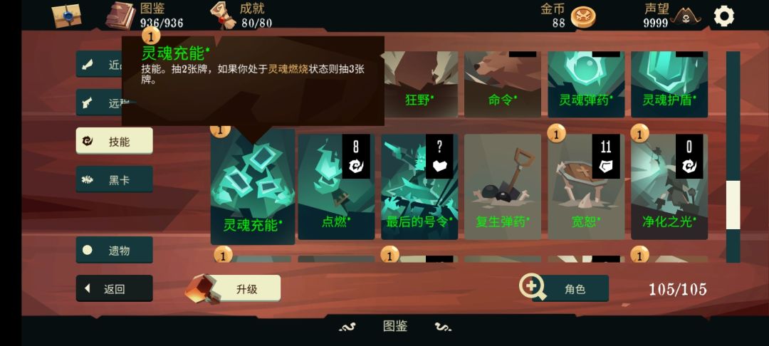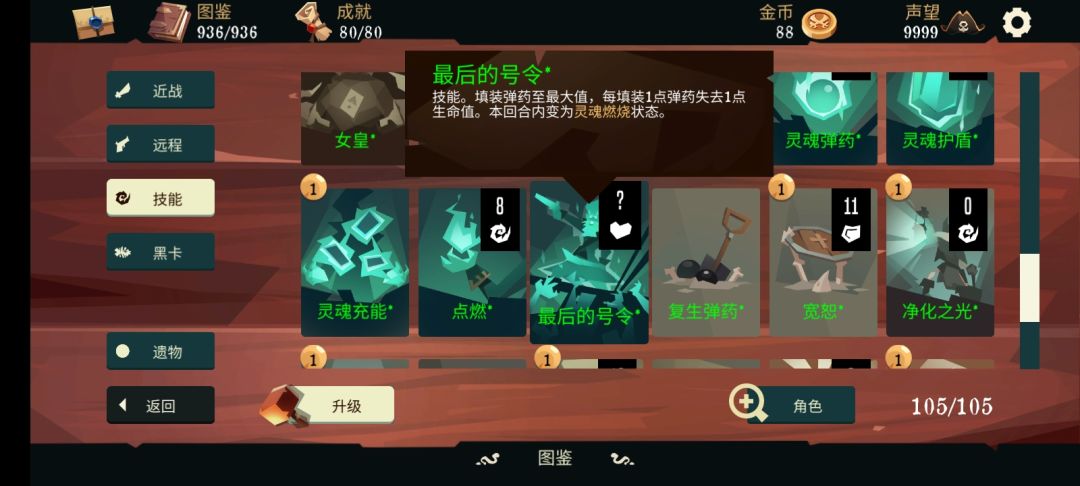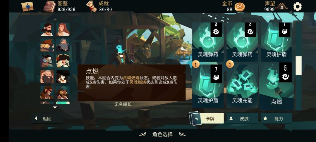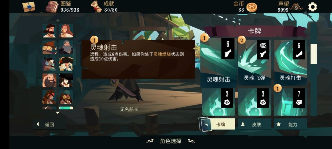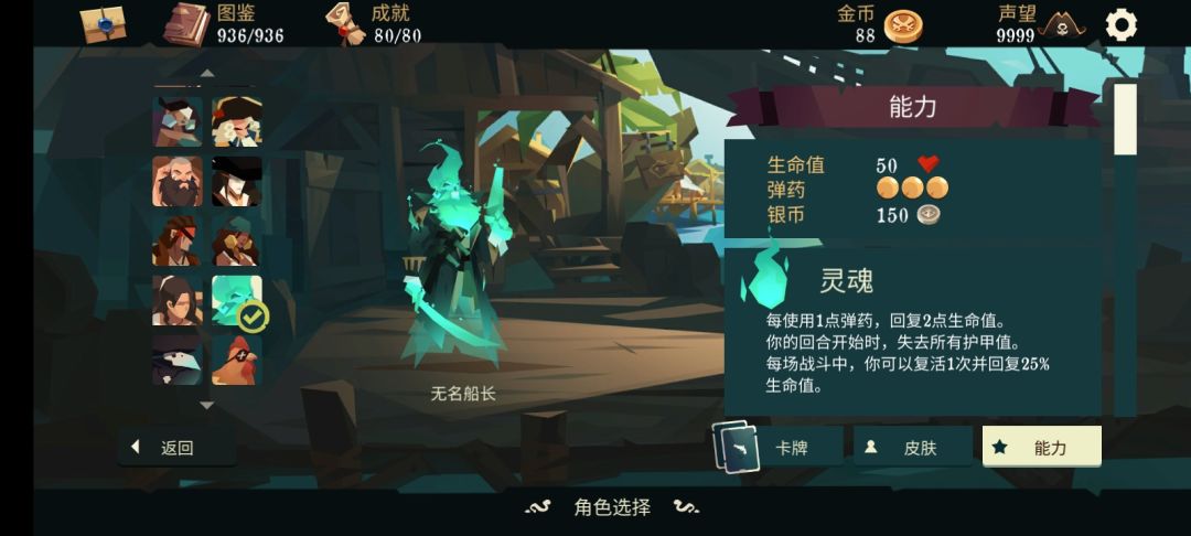 无名的技能比较通俗易懂,使用1点弹药回复2点生命值,使得这个角色非常稳重(困难模式也可以轻松通关)运用搓澡永动甚至可以一回合满血(这个后面会讲)回合开始时失去所有护甲,简单来讲就是所有护甲只能临时扛一回合伤害,这就意味着这个角色并不适合叠甲,最后是复活,这个复活看着很强,实际非常鸡肋,一般用不上