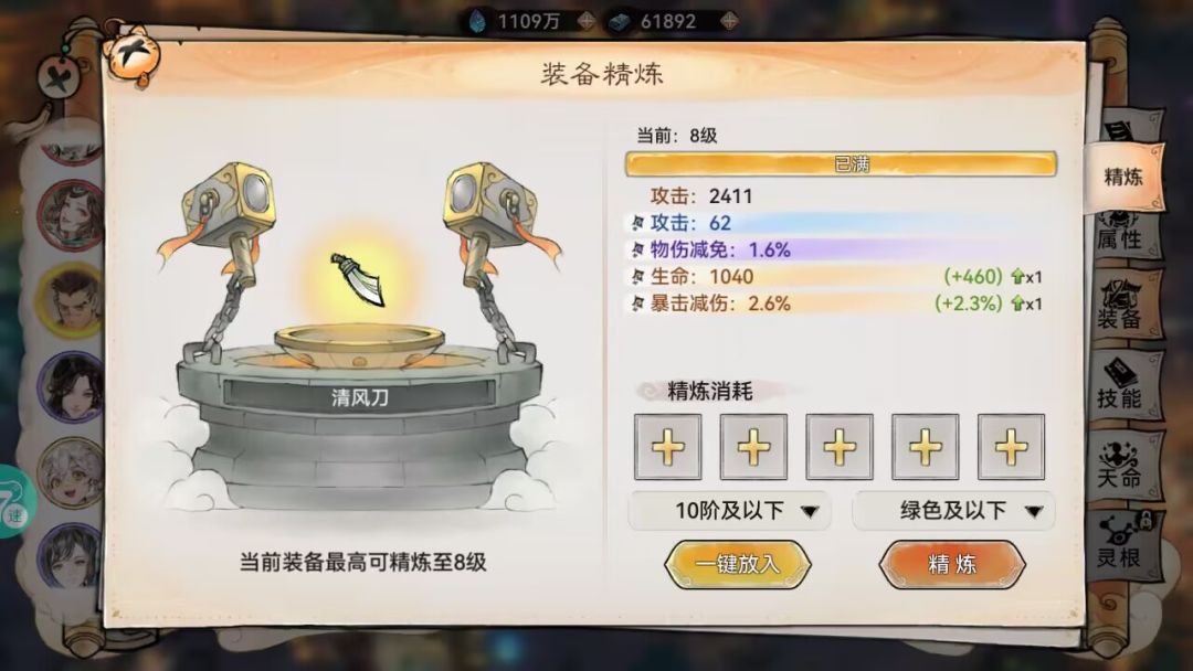推荐精炼石精炼,因为单独装备精炼一个装备只能放一格要点很多次,而精炼石一格可以放999个