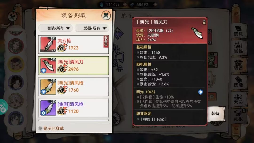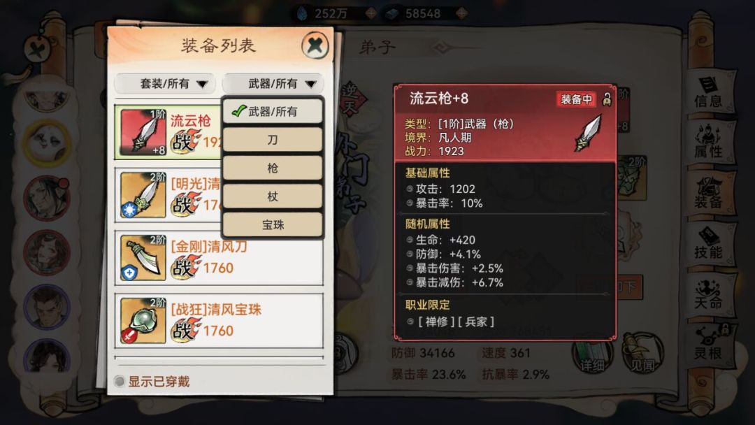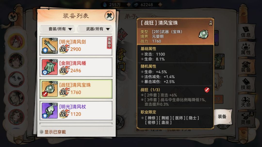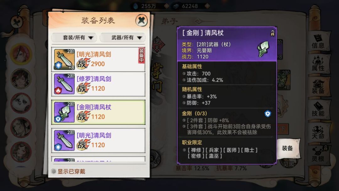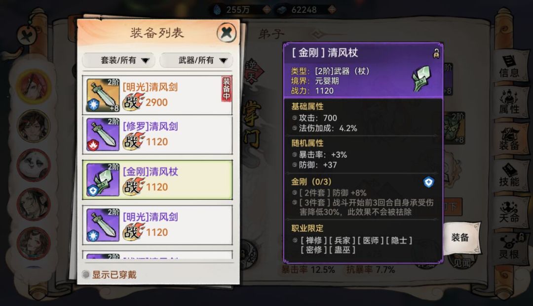 而弟子可以装备哪些武器取决于武器的种类和弟子的职业