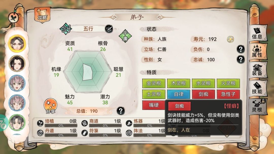2.某些词条会导致弟子武器不对而让弟子攻击大幅降低,或者武器符合词条会提升攻击,如剑痴