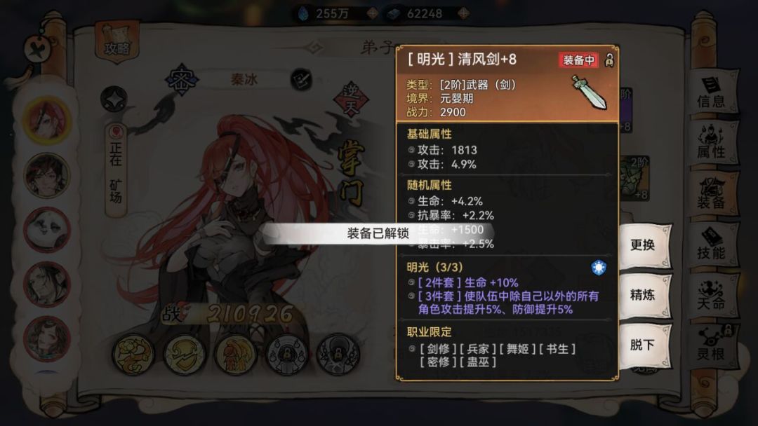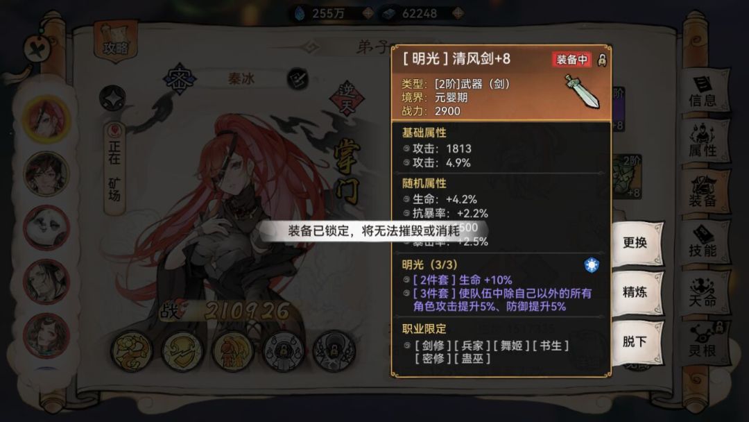 (套装效果不可叠加,多位弟子穿明光套只触发二件套加成,而三件套效果不触发)