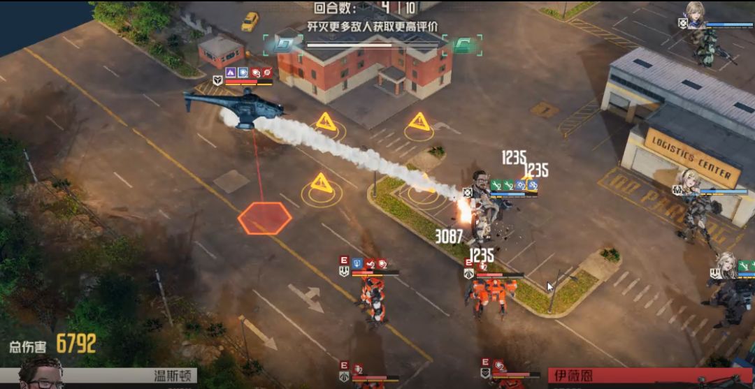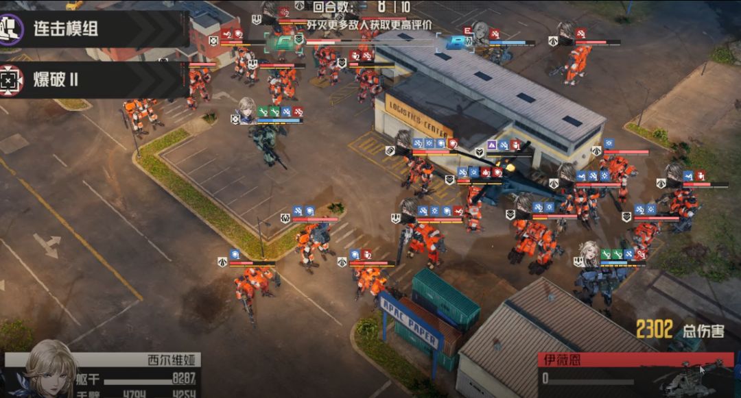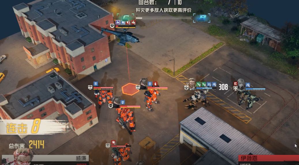 下边温斯顿和艾琳即使尚且存活,能够攻击,也不要攻击右边直升机了,因为敌人中有维修兵,右边直升机血量注定比左边要高,无法同时消灭,必须额外再攻击一次,而这只有直升机减伤消灭才能实现