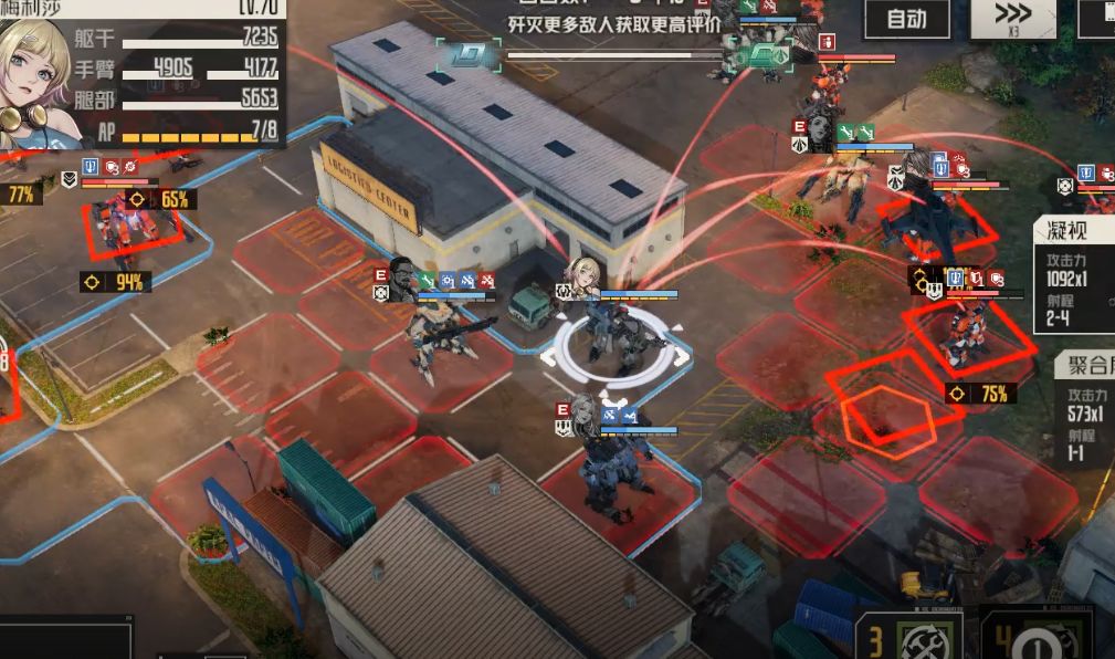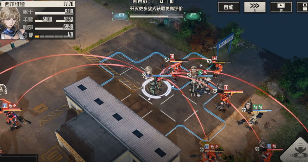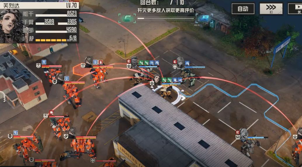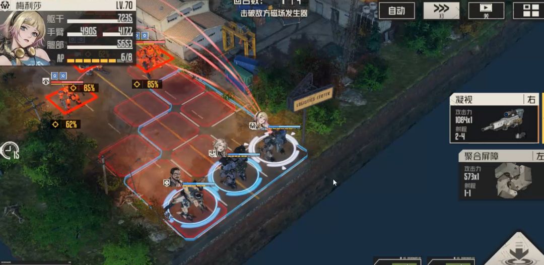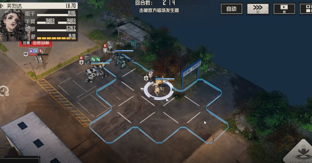 直升机位置发生变动,艾琳这里可以考虑攻击右边新出现的扎堆敌人,也可以石墨弹头攻击左边直升机,具体视ap剩余及具体情况而定