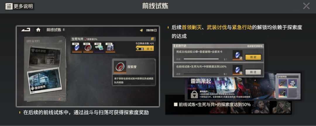 在新版本中,前线试炼出现了新的关键标识——探索度,探索度实际就是一个进度条,通过一次前线试炼就会获得一定进度,评价越高,获得的探索度就会越多,每个不同的评价级别首次通过都会获得一次性的高额探索度,不同编队不重复生效。