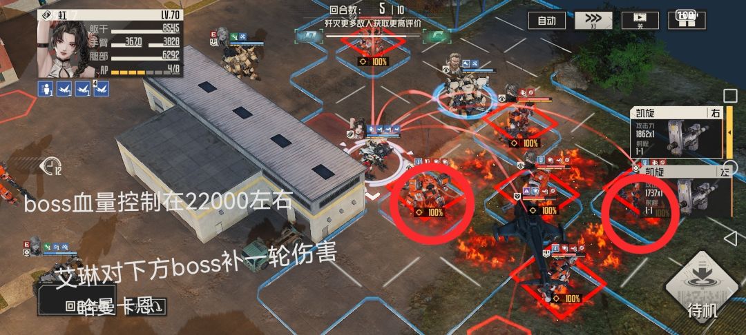 第五回合 艾琳先手,boss24000血量的话,第二次石墨给到boss,这样回合结束血量正好22000,虹依旧优先重机枪手,开局4ap秒了狙击手(不然会给威廉减攻),3ap的话秒重机枪回头a一下之前的格斗家