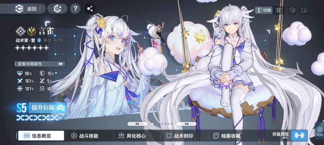 言雀,六星雷系同调者,菱形战术家,接下来从人物立绘、队伍适配度、战斗能力、未来期望度几个方面进行分析(满星5星)。