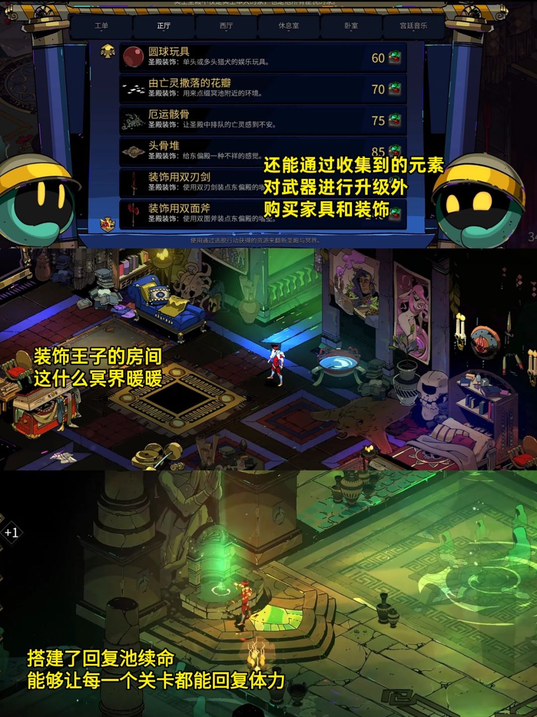 本作除了肉鸽打怪,推进剧情以外,还有着众多收集+经营+恋爱(你没听错)要素。在地牢中收集不同道具,可以解锁相关人物的剧情,不仅如此,也可以在每一次的战斗后获取资源给自己的花园+房间升级或者装扮,让他们具有更强大的功能。或者钓钓鱼,撸撸你的地狱三头犬,享受悠闲时光!