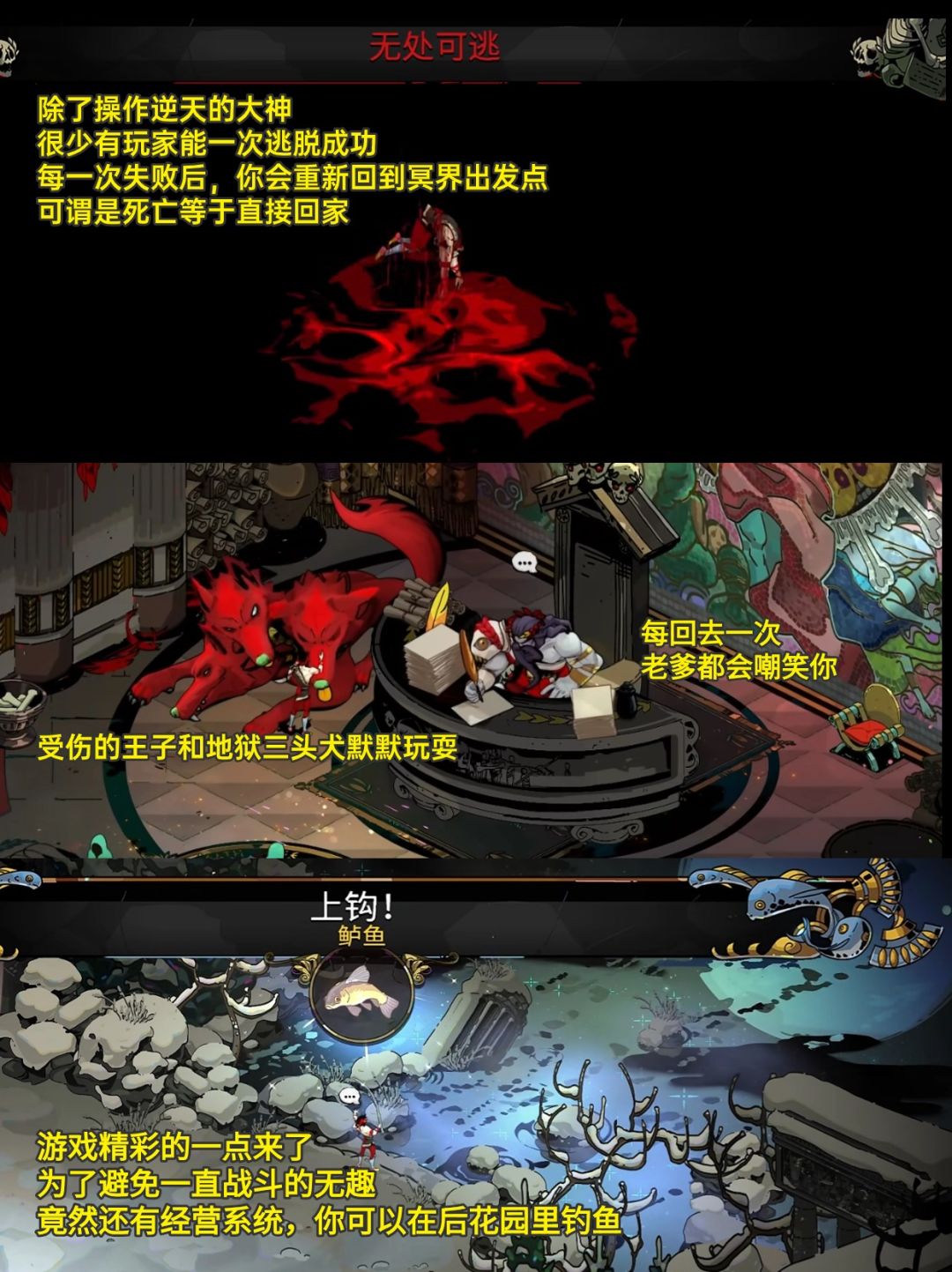 大多数肉鸽优秀,都会有剧情偏弱,但玩法侧重战斗系统的偏向,但是Hades选择两手抓,本篇讲述的主线剧情非常简单,叛逆的冥界王子哈迪斯离家出走,打通冥界十八层才能前往奥林匹斯山跟老爹说拜拜的故事。但制作组却花费了大量心血呈现每一位NPC的形象,光是文本对话就高达百万字。除了自己的父亲哈迪斯,几乎其他所有的NPC,从母亲、到奥利匹斯山的众神们都具有非常鲜明的性格特色,而每次失败归来,NPC的台词都会有所变,更是埋藏了不少彩蛋和线索。尤其是老爹的台词,每一次死亡回家,都会被老爹阴阳![[表情_吃瓜]](https://img.tapimg.com/market/images/d07b262774c8a022a7dddbc39683da6b.png)