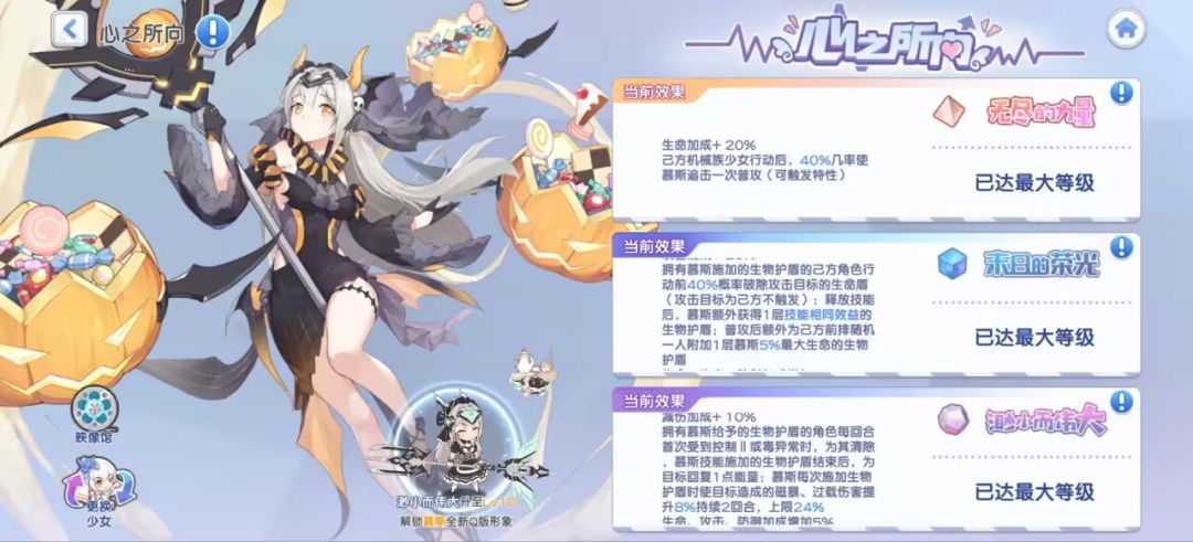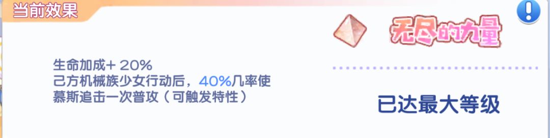 心之所向一——无尽的力量:己方机械族少女行动后,40%几率使慕斯追击一次普攻(可触发特性)