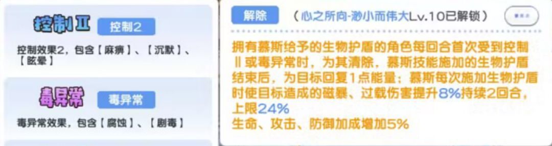 1、拥有慕斯给予的生物护盾的角色每回合首次受到控制Ⅱ或毒异常时,为其清除,
