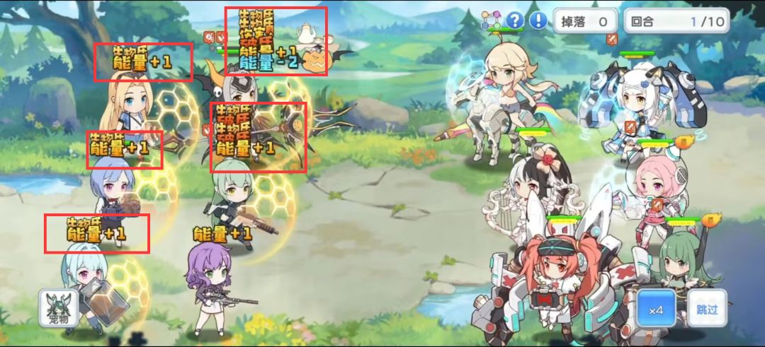 一次技能,五人吃盾,【生物护盾】的覆盖率非常高,同理,二星的【破盾】buff覆盖率也很高,四星的减控减毒也触发频繁。